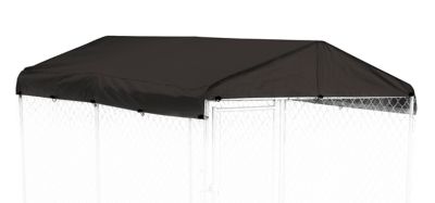 It features a durable powder coated steel frame with heavy duty green black tarp cover to protect your dog from the sun rain and snow.